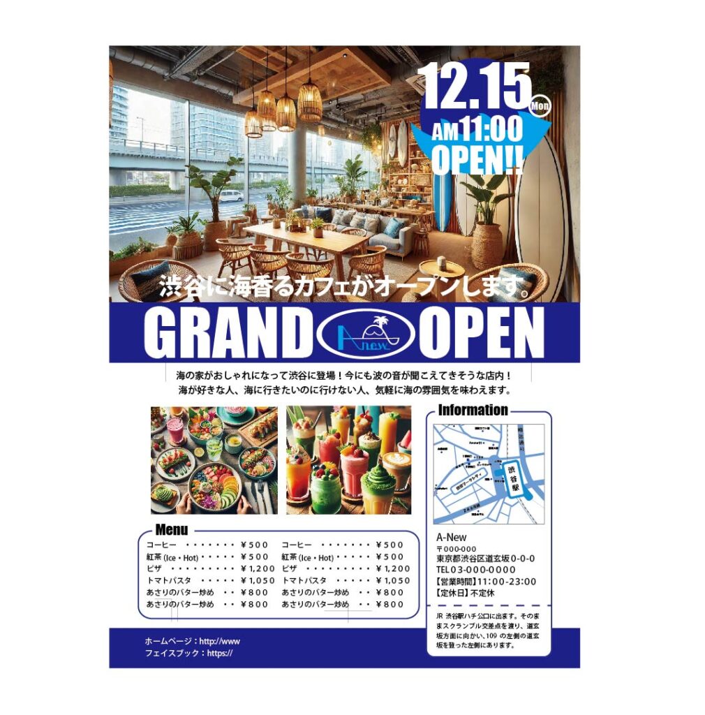 都内に新規オープンするカフェをイメージしたオープンチラシを制作致しました。